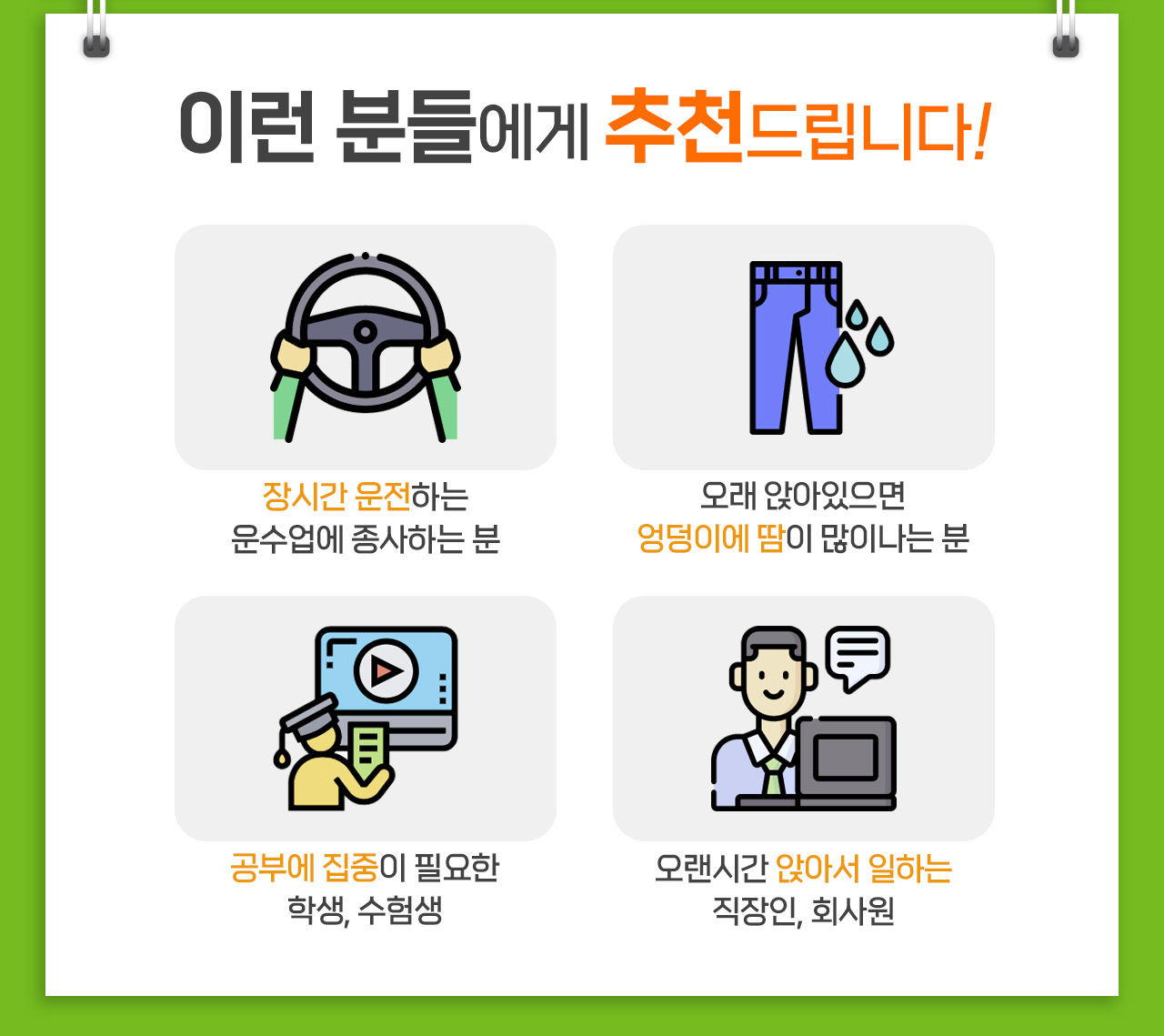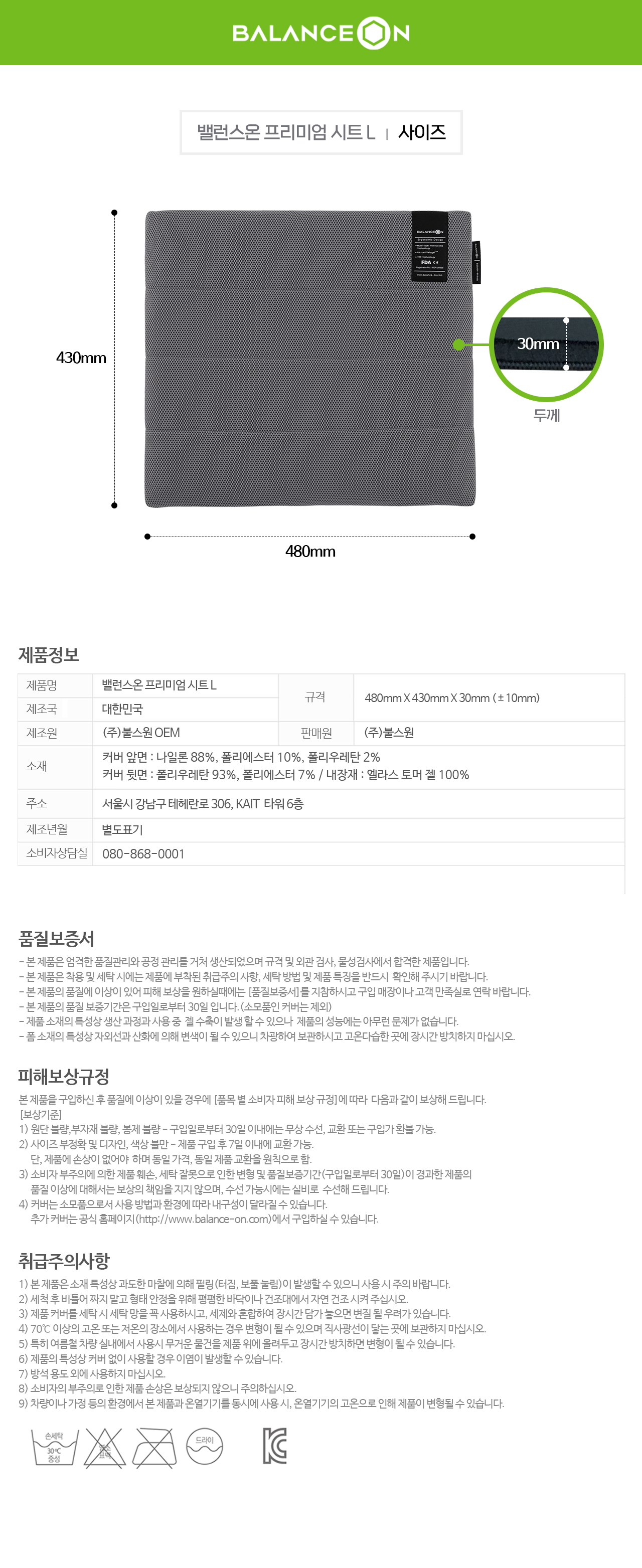 문의내용안녕하세요? 라지 사이즈 구입했는데요 문의답변안녕하세요? 고객님~ 밸런스온 시트는 내구성이 뛰어나 쉽게 찢어지거나 눌리지않고 오랫동아 탄성을 유지하여 사용가능하지만 취급주의 사항은 방석용도 외에 사용하지 않기를 권장 드리고 있습니다. 감사합니다. |
